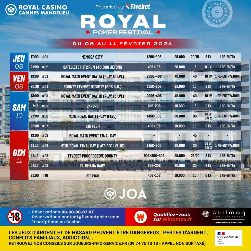 Sur ce Royal Poker Festival, plusieurs tournois annexes figurent au menu. On peut citer entre autres le Bounty Fivebet Nightly à 150€, l’Apero à 90€, le Mini Royal à 175€. Un PLO à 100€ est programmé (30.000 jetons – 20 minutes). Des tournois aux Buy-in très accessibles qui devraient faire le plein !