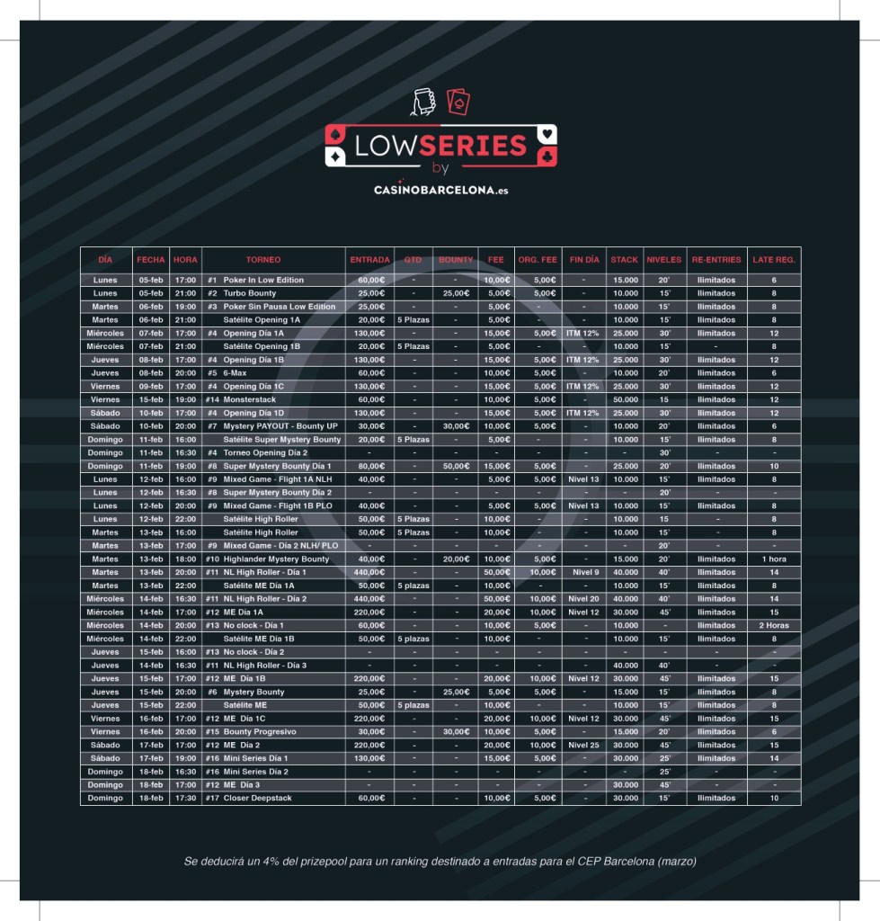 Le Casino Barcelona va accueillir du 5 au 18 février 2024, la deuxième édition des Low Series by CasinoBarcelona.es. Au programme : 16 tournois très accessibles avec de nouveaux formats. Un événement qui devrait faire le plein !