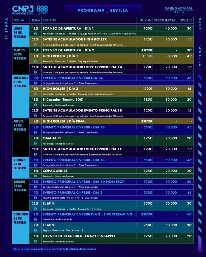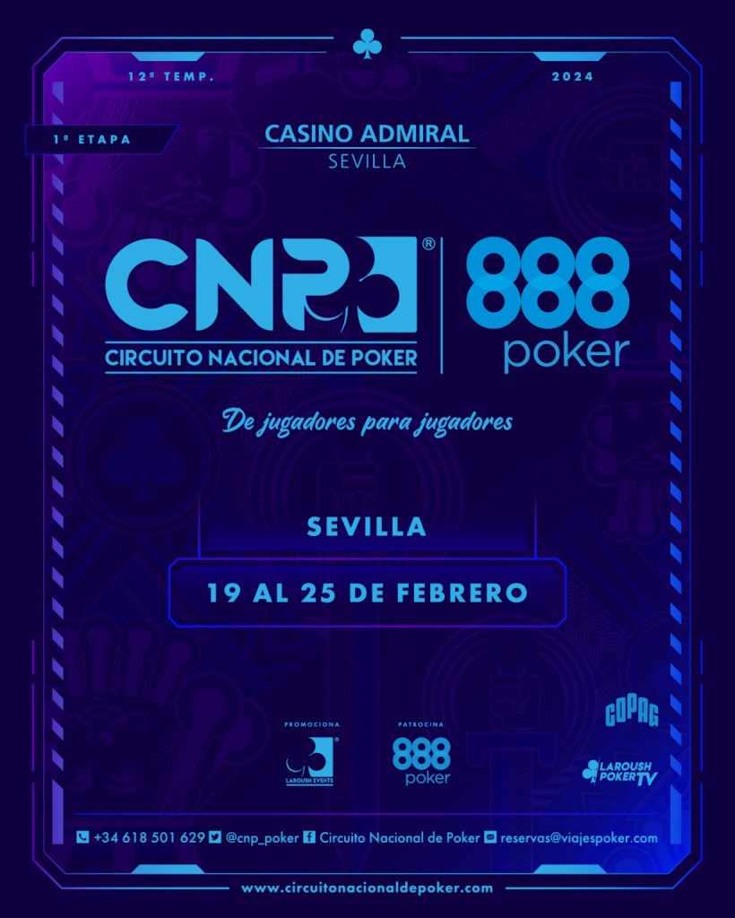 Le Casino Admiral de Séville accueillera la première étape du Circuit National de Poker (CNP) du 19 au 25 février. L’établissement sévillan lancera la 12e saison de la célèbre franchise espagnole.