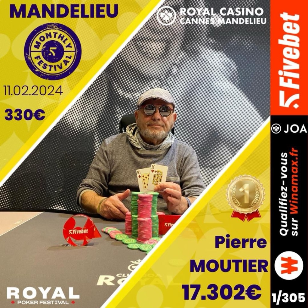 Le Main Event à 330€ a fait le plein avec 305 entrants. Dans la dernière ligne droite, c’est Pierre Moutier qui a tiré son épingle du jeu et empoche 17.302€. Le vainqueur avait déjà eu l’occasion de briller sur le Mimosa City en prenant une belle 3e place.