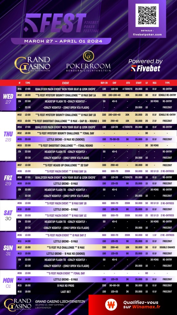 Les équipes d’Accepted Action (propriétaire des marques Fivebet, Swiss Poker Series) viennent de dévoiler un nouveau projet Live : le 5Fest. Grande première fin mars au Grand Casino Liechtenstein. Une terre de poker en plein essor !