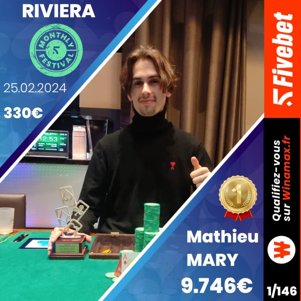 Du 22 au 25 février, le Casino Grand Cercle d’Aix-les-Bains organisait son festival « Riviera Monthly Poker », en partenariat avec Fivebet. Matthieu Mari décroche la timbale sur le Main Event.