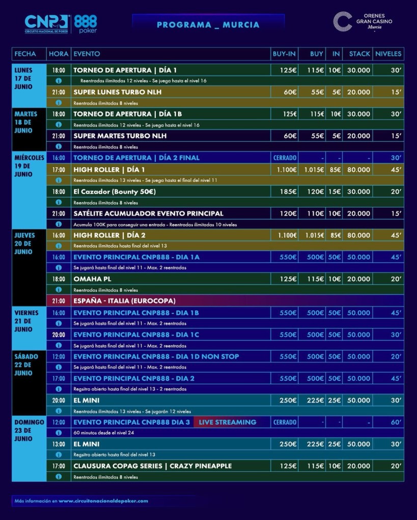 Murcie, au Sud de l’Espagne, va accueillir pour la première fois une étape du Circuit National de Poker (CNP). Ce festival aura lieu du 17 au 23 juin à l’Orenes Gran Casino Murcia. Le programme est, comme d’habitude, très alléchant.