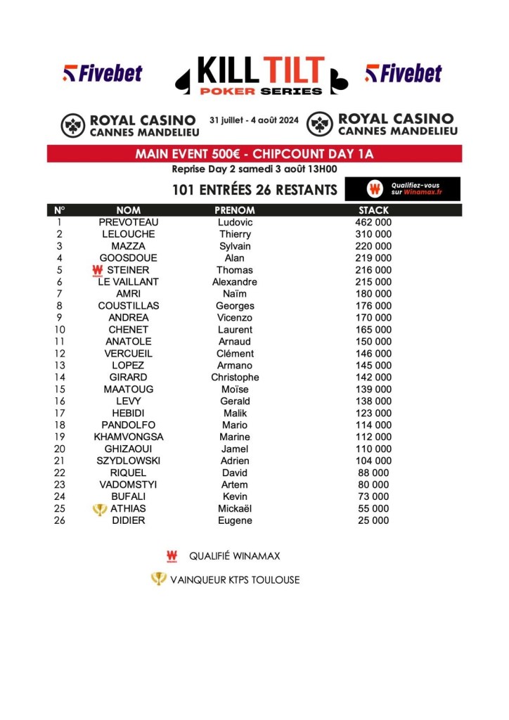 Au total, 26 joueurs décrochent leur ticket pour le Day 2. C’est Ludovic Prevoteau qui mène les troupes avec 462.000 jetons. Il est suivi de Thierry Lelouche (310.000) et Sylvain Mazza (220.000).