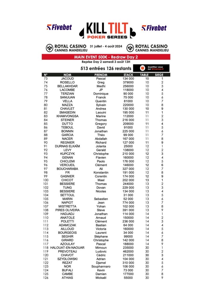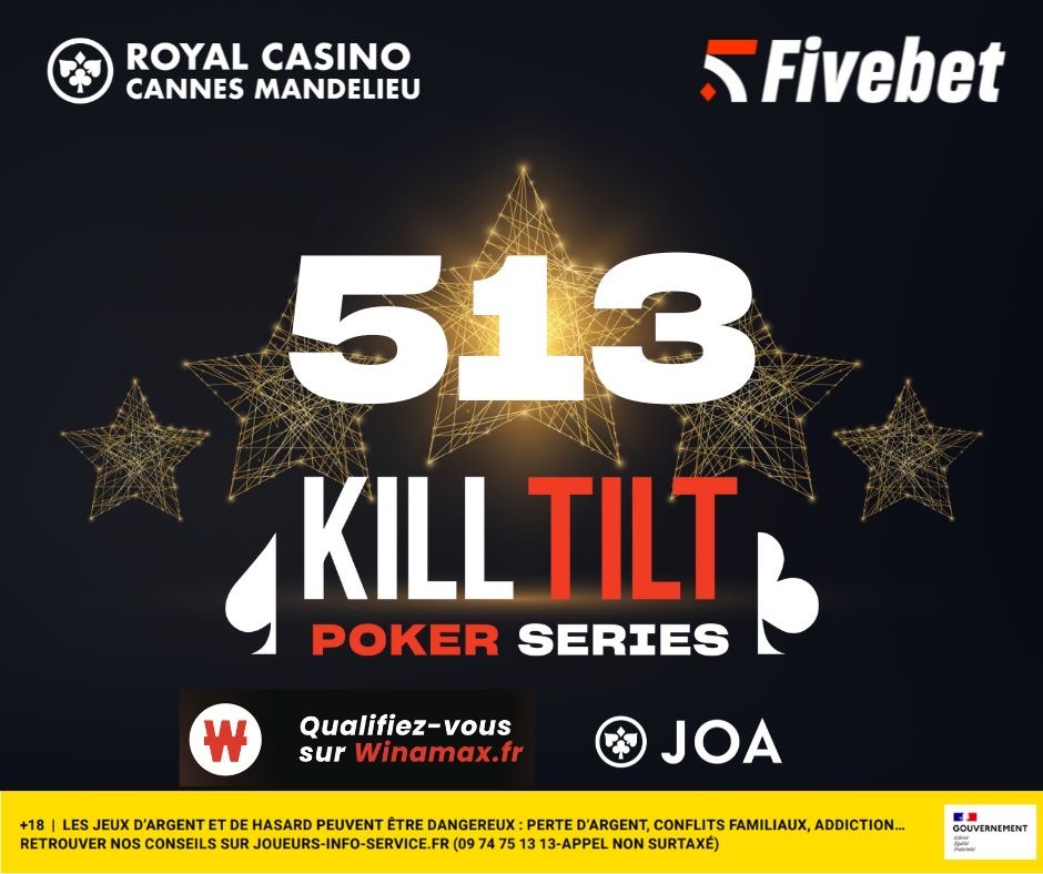Les Kill Tilt Poker Series by Fivebet se poursuivent au Royal Casino de Cannes-Mandelieu. Hier, les Day 1C ( 213 entrants) et Day 1D (64 entrants) ont permis de porter l’affluence totale sur le Main Event à 513 entrants. Un beau score !