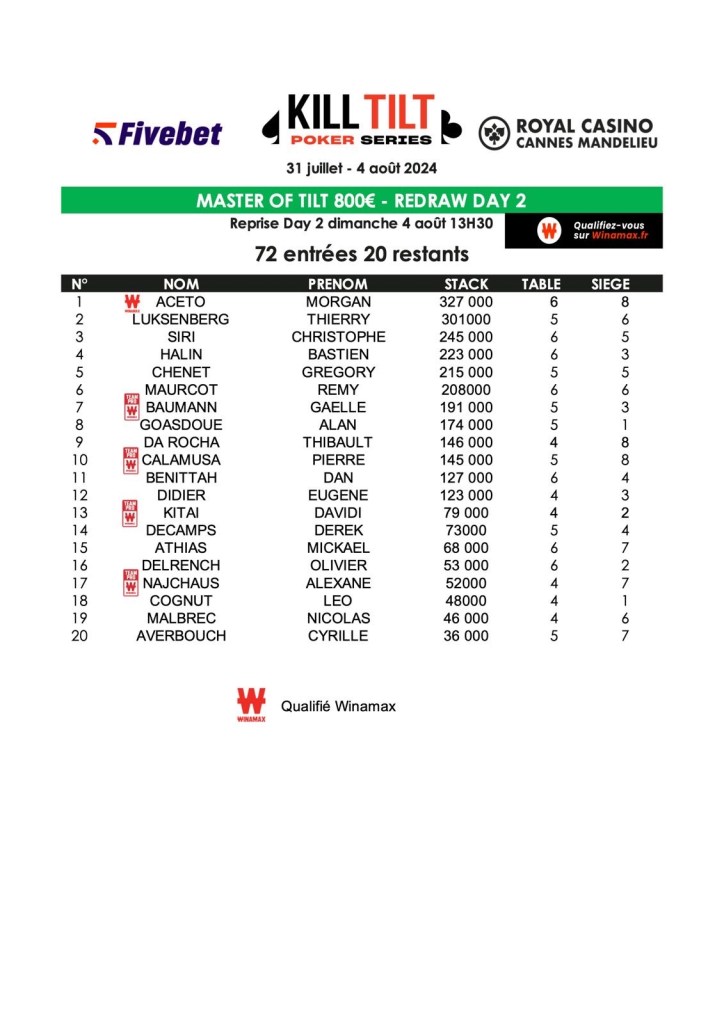 On retrouve du beau monde. On peut citer Morgan Aceto, Gaëlle Baumann, Pierre Calamusa Alexane Najchaus ou encore Davidi Kitai. Le Team Winamax est en force.