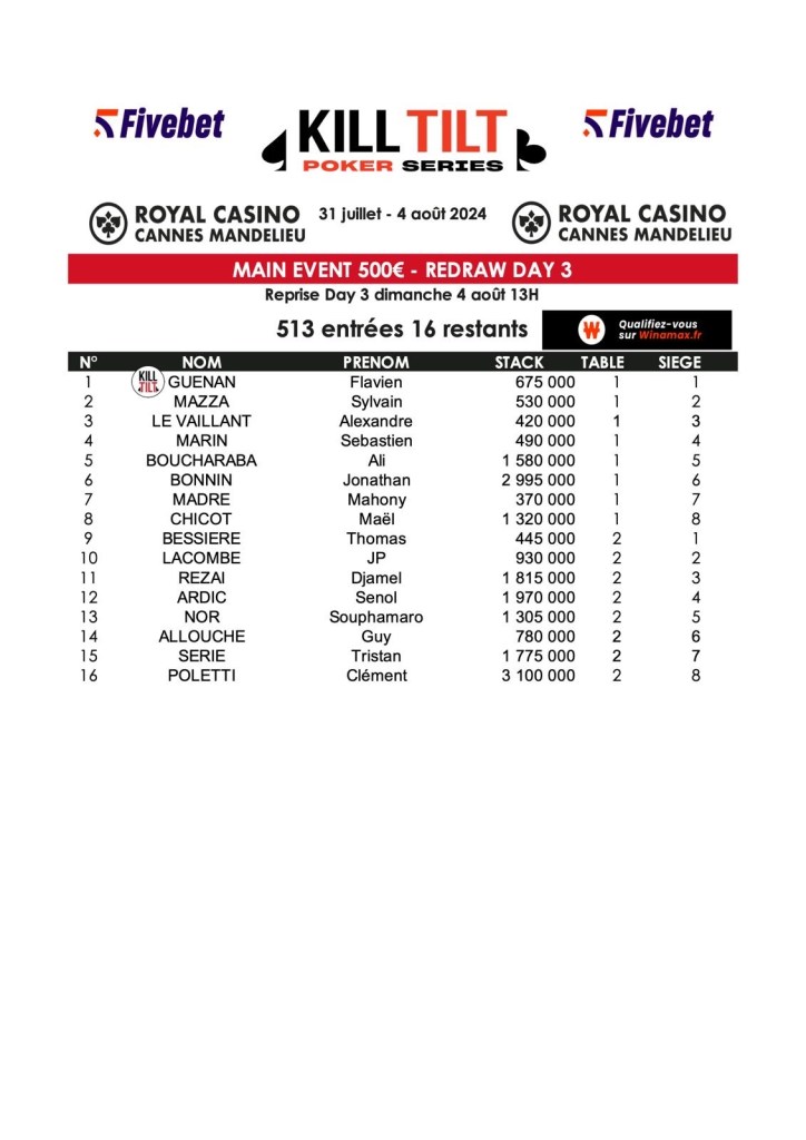 Sur les 513 entrants sur la ligne de départ, 16 joueurs sont toujours en lice. Parmi les survivants, Flavien Guenan portera les couleurs de Kill Tilt, Alexandre Le Vaillant ou encore Sylvain Mazza peuvent encore rêver au titre.