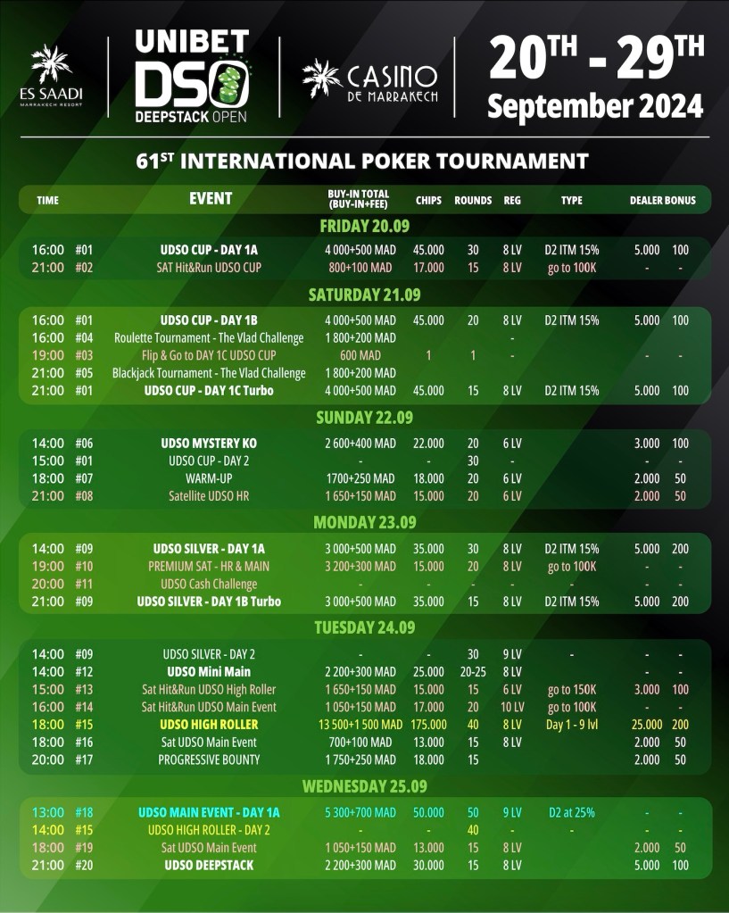 Pendant l’UDSO Marrakech, au Casino Es Saadi, des tables de cash game seront ouvertes. Elles seront accessibles pour toutes les bourses. Selon l’affluence, l’équipe du casino ouvrira des tables selon la demande.
