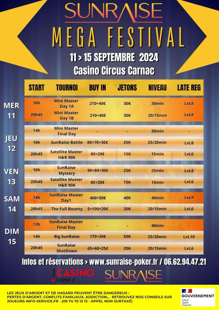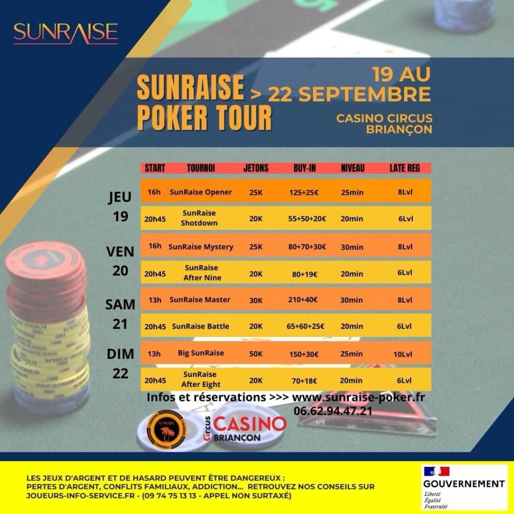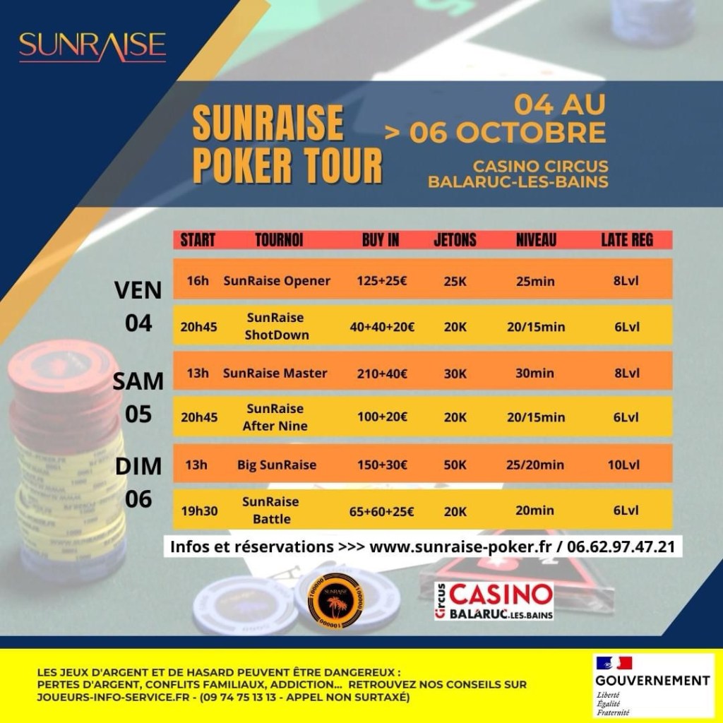 Pour participer à ces événements, rendez-vous sur le site internet : www.sunraise-poker.fr où vous trouverez tous les détails des programmes et la possibilité de réserver.