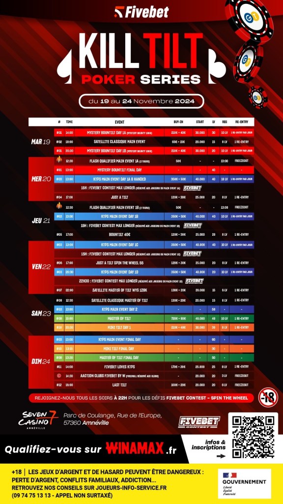 Les Kill Tilt Poker Series (KTPS) reviennent en force, en partenariat avec Fivebet, pour leur dernière étape de 2024, du 19 au 24 novembre, au Seven Casino d’Amnéville. Après le succès des étapes de Toulouse et Mandelieu, ce festival promet une belle expérience de poker, avec encore plus de tables, de croupiers et d’animation.