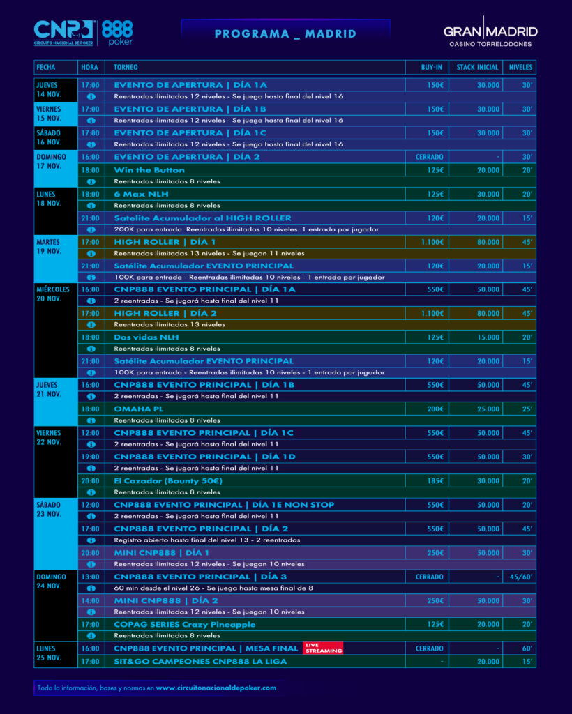 Le Main Event débutera donc le mercredi 20 novembre et se prolongera jusqu’à la table finale du lundi 25 novembre. En parallèle, l’organisation diffusera en direct la journée de clôture et la table finale avec l’équipe de LaroushTV, qui proposera des commentaires en direct par les experts Antonio González « Jonwayne » et Alberto Perez « Catof ». Cette retransmission permettra aux fans de suivre en temps réel l’évolution des mains décisives.