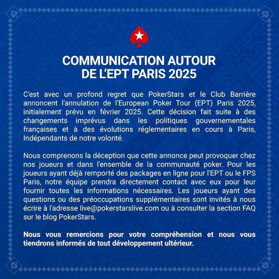 De nombreux joueurs s’étaient déjà qualifiés en ligne pour participer à l’EPT ou au FPS (France Poker Series) Paris, intégrés au festival. PokerStars a assuré qu’ils seraient contactés directement pour clarifier leur situation et leur proposer des alternatives.
