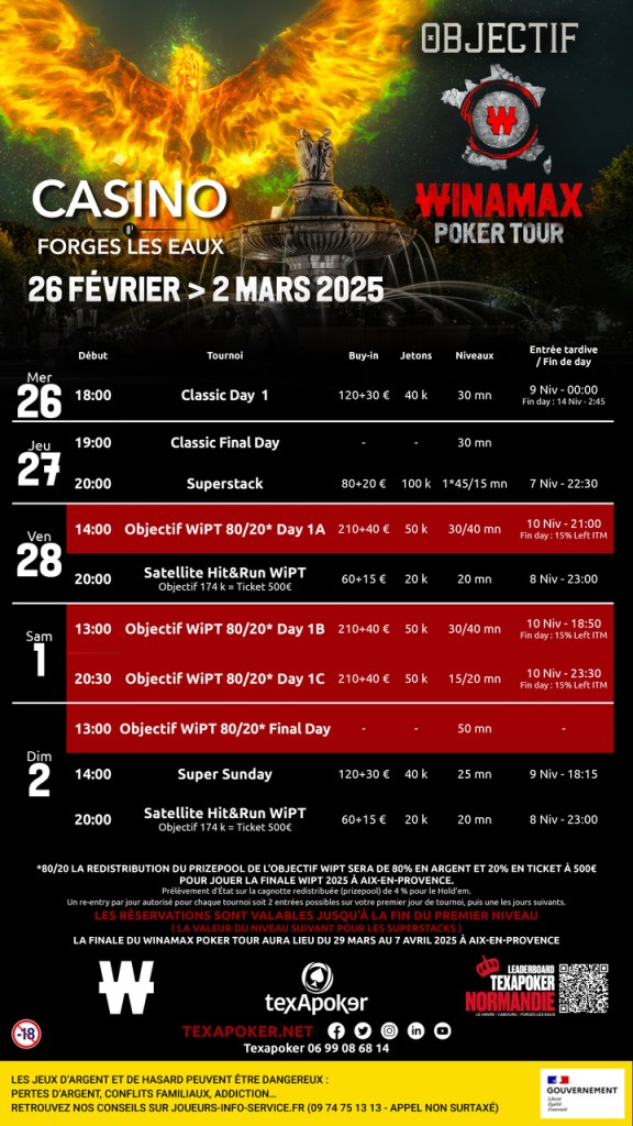 Forges-les-Eaux est un lieu de rendez-vous pour les amateurs de tournoi de poker. En plus du cash game, le casino propose des tournois tels que l’Objectif WiPT by TexaPoker à 250€, avec un stack de départ de 50k jetons et des niveaux de 30 à 40 minutes. 20% du prizepool de cet événement est converti en tickets 500€ pour la grande finale du WiPT à Aix-en-Provence. De nombreux autres tournois annexes comme le Classic 150, le Superstack 100 et les satellites Hit & Run sont aussi programmés. Rendez-vous du 26 février au 2 mars !