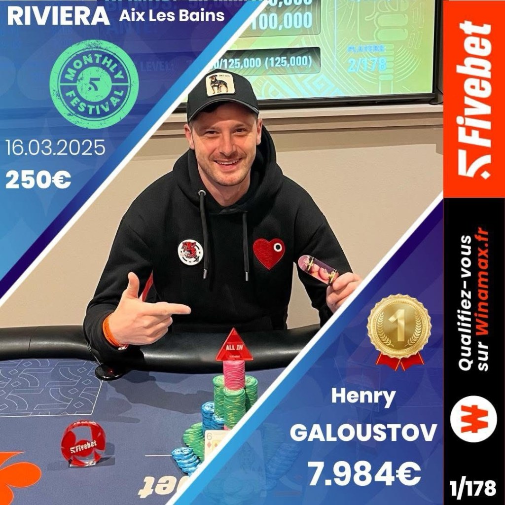 Le Riviera Monthly, disputé du 14 au 16 mars 2025 au Casino Grand Cercle d’Aix-les-Bains, en partenariat avec Fivebet, a rassemblé 178 participants, générant un prizepool de 35 884,80 €. Après un week-end de compétition intense, c’est Henry Galoustov qui s’est imposé, empochant 7 984 €.