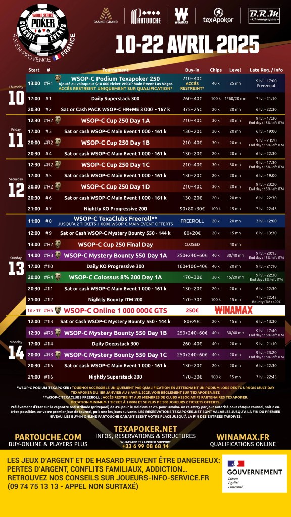 Que vous soyez un grinder aguerri ou un amateur passionné, le programme des WSOPC Aix-en-Provence propose une multitude de tournois adaptés à tous les profils. Entre le Colossus à 200€, le Mystery Bounty à 550€ et le Super High Roller à 3 000€, sans oublier le Main Event à 1 000€ garantissant un million d’euros, chacun peut y trouver son compte et viser une bague tant convoitée.