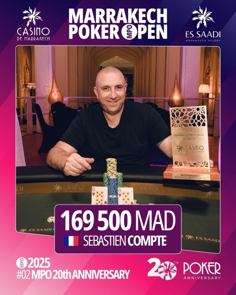 - Enfin, Sébastien Compte marque l’histoire en remportant le Tournoi Anniversaire des 20 ans du Poker à Marrakech, pour un gain de 169 000 MAD. Il devance Adil Oubaaous (124 500 MAD) et Fadhil Farag (90 500 MAD).