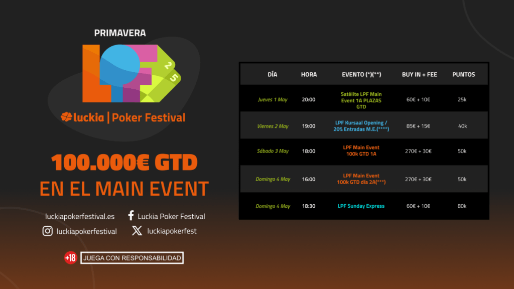 ¡Comenzamos! Le Luckia Poker Festival (LPF) revient sur le devant de la scène avec une première étape qui sent bon les tapas, l’océan et les gros fields : direction le Casino Kursaal de Saint-Sébastien, du 1er au 4 mai, pour lancer cette édition printanière qui s’annonce piquante comme une pipérade basque.