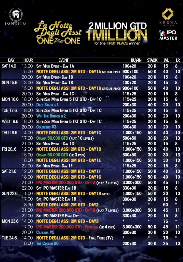 Du 14 au 24 juin 2025, direction Tirana pour un véritable feu d’artifice de poker live avec La Notte Degli Assi One Plus One, qui promet un Main Event tout simplement démentiel : 2 millions d’euros garantis, dont 1 million pour le champion. Oui, vous avez bien lu : un million pour la gagne.