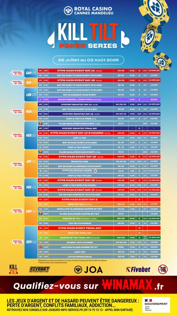 Du 26 juillet au 3 août, les Kill Tilt Poker Series font leur grand retour en bord de Méditerranée, dans le cadre idyllique du Royal Casino JOA de Mandelieu. Au programme : 23 tournois, un Main Event très accessible avec sept jours 1, des satellites live & online à la pelle… et une ambiance comme on les aime.