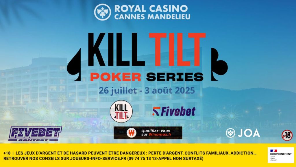 Du 26 juillet au 3 août, les Kill Tilt Poker Series font leur grand retour en bord de Méditerranée, dans le cadre idyllique du Royal Casino JOA de Mandelieu. Au programme : 23 tournois, un Main Event très accessible avec sept jours 1, des satellites live & online à la pelle… et une ambiance comme on les aime.