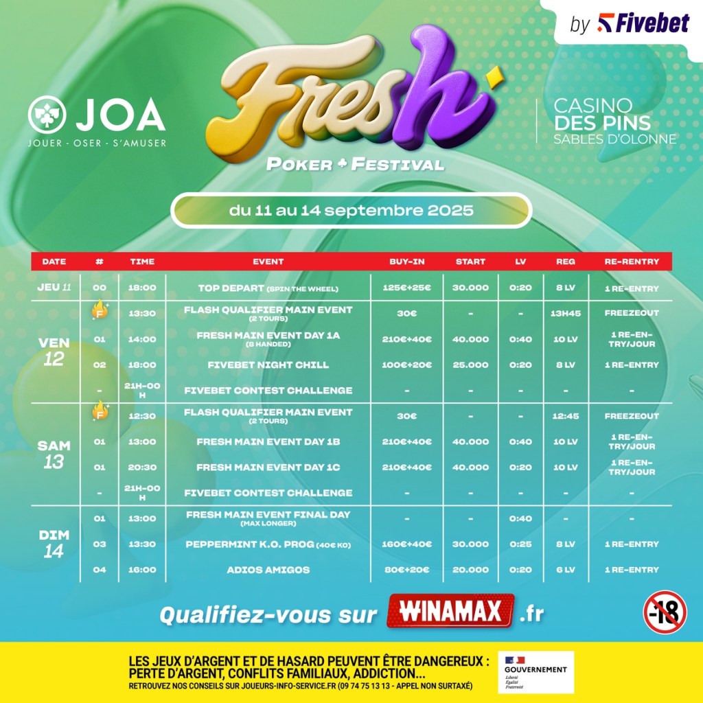 Dès le jeudi 11, le Top Départ donnera le ton avec un Spin The Wheel à 150€. Le lendemain, on entre dans le vif du sujet avec le Fresh Main Event (250€ – 40 000 jetons – 40 minutes), décliné en trois Day 1. A noter que pour les joueurs de clubs affiliés à Winamax, un Max Longer est prévu sur le Main Event.
