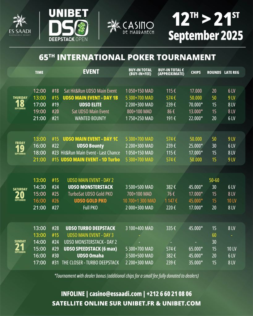 Le Main Event UDSO se jouera du 17 au 21 septembre avec un buy-in de 6000 MAD (~575 €). Le programme est large : High Rollers à 12 000 et 15 000 MAD, UDSO Cup à 4 500 MAD, et des side events à partir de 2500 MAD (~240 €). Que vous soyez joueur récréatif ou régulier, il y aura toujours un tournoi à votre mesure.