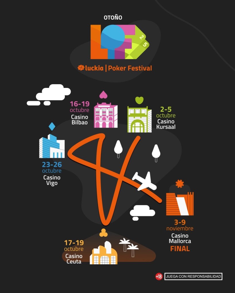 Le Luckia Poker Festival (LPF) reprend la route et démarre sa tournée d’automne à San Sebastián. Du 2 au 5 octobre 2025, le Casino Kursaal accueillera la première étape d’un circuit espagnol désormais bien installé, avant des escales à Bilbao, Ceuta et Vigo, puis une Grande Finale à Mallorca les 8 et 9 novembre.