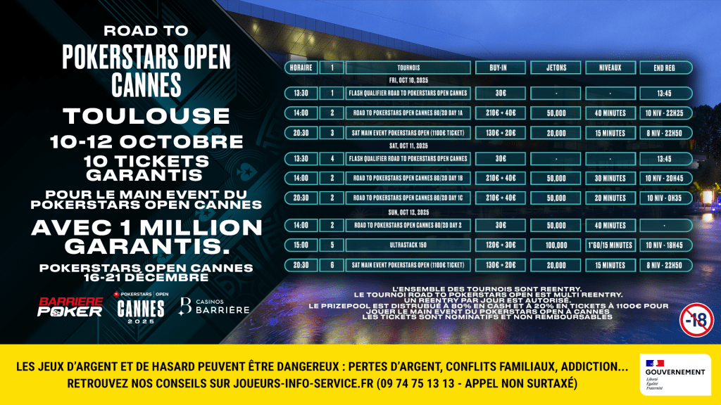 Un choix qui renforce la dimension “step by step” du circuit : grinder son 250 € peut directement ouvrir les portes d’un 1 100 € à un million garanti. À noter que 10 tickets PSO sont d’ores et déjà garantis sur chacune des deux premières étapes (Toulouse et Paris).