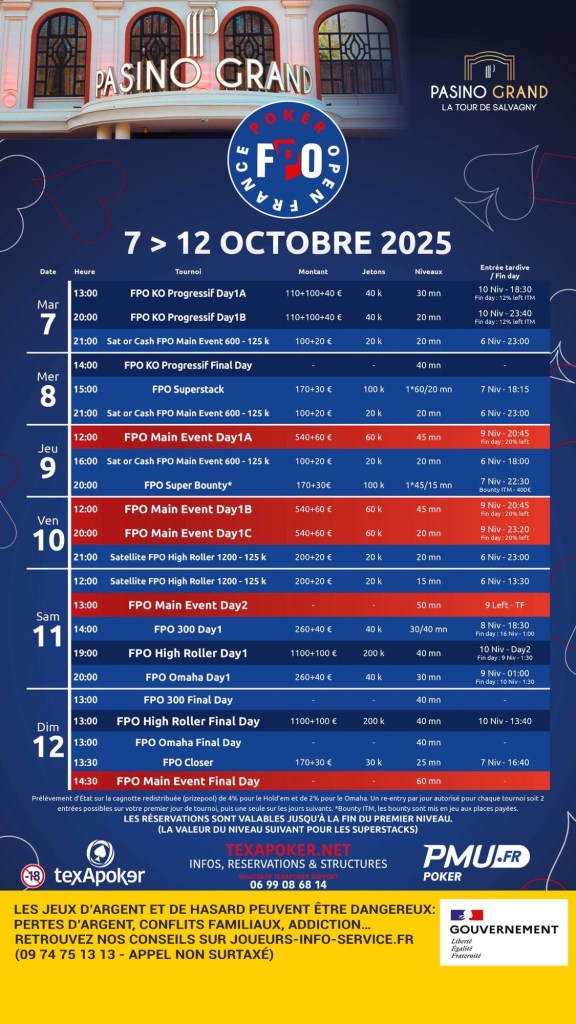 Le festival s’ouvrira dès le mardi 7 octobre avec un FPO KO Progressif à 250€, une mise en bouche idéale pour lancer la semaine. Les joueurs pourront ensuite tenter leur chance sur le Main Event à 600€, véritable cœur battant de l’étape. Trois journées de départ sont prévues (Day 1A jeudi, Day 1B et Day 1C vendredi), avant un Day 2 disputé le samedi et une finale programmée le dimanche 12 octobre. L’occasion pour les grinders comme pour les amateurs éclairés de se mesurer dans une structure taillée pour le jeu.