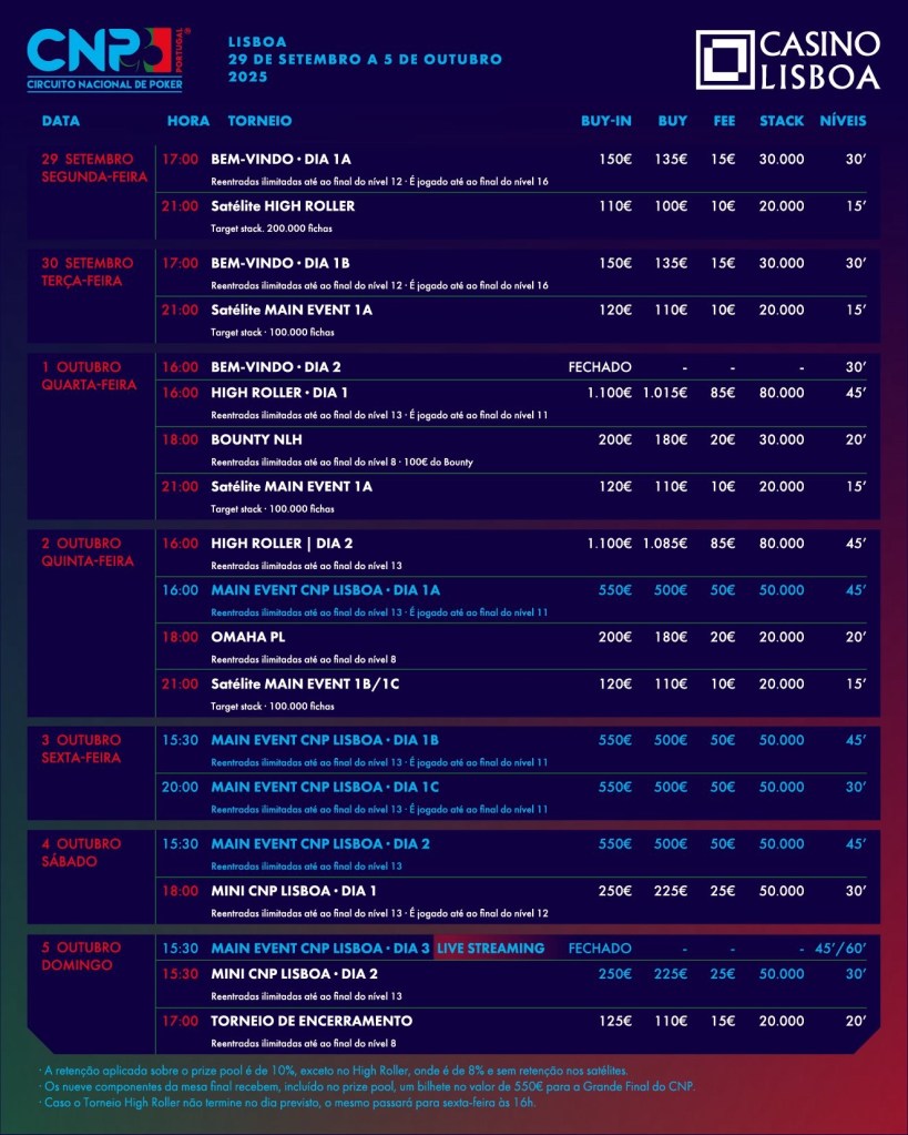 Le CNP Lisboa s’adresse à tous les profils : le Bem-Vindo (150 €) en ouverture dès le 29 septembre, des satellites quotidiens pour décrocher un siège, un Omaha Pot Limit (200 €) pour les amateurs de variantes, le Mini CNP Lisboa (250 €) le 4 octobre et le Torneio de Encerramento (125 €) pour finir la semaine en beauté.