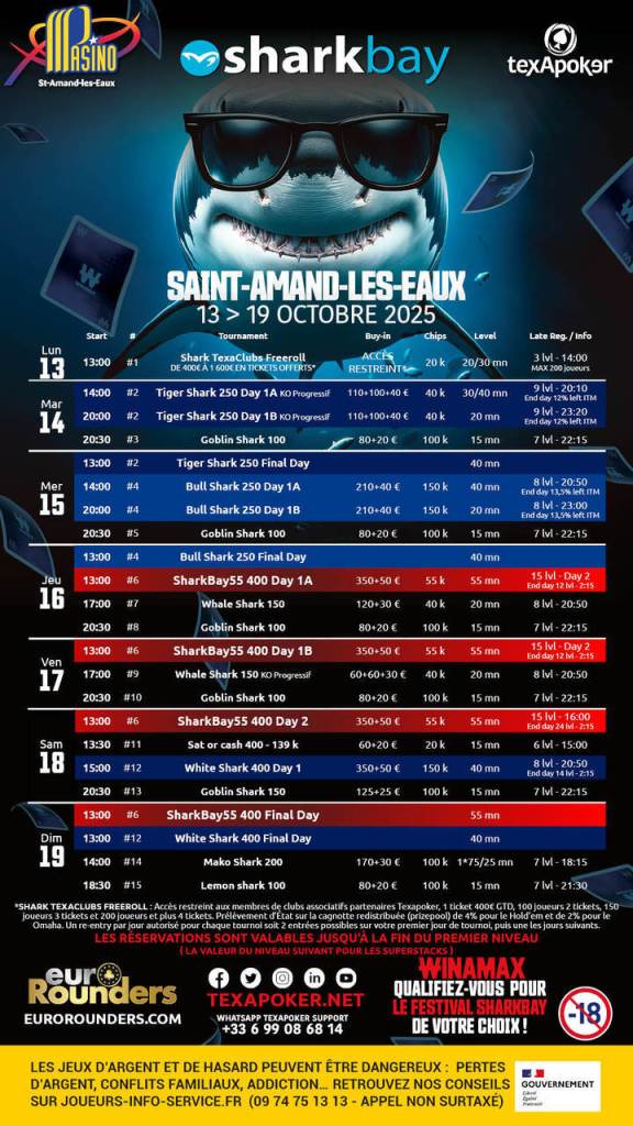Du 13 au 19 octobre 2025, le Pasino de Saint-Amand-les-Eaux (groupe Partouche) accueillera une nouvelle édition du festival SharkBay, organisé en partenariat avec Texapoker et EuroRounders. Devenu au fil des ans un rendez-vous incontournable, ce festival s’annonce une fois encore comme un point de ralliement majeur pour la scène poker française et frontalière.
