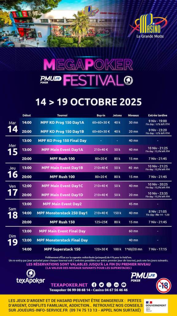 Le Pasino Partouche de La Grande-Motte s’apprête à vibrer au rythme des cartes : du 14 au 19 octobre 2025, le complexe accueillera une nouvelle édition du MegaPoker Festival, organisé en partenariat avec Texapoker et PMU Poker.