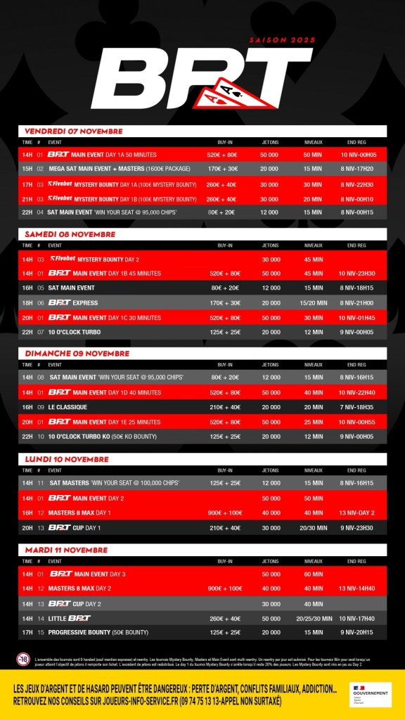 En ouverture, les satellites à 100 € permettront d’obtenir un siège pour les plus beaux tournois du week-end, tandis que le Little BPT à 300 €, prévu le dernier jour, offrira une ultime occasion de briller avant le clap de fin.