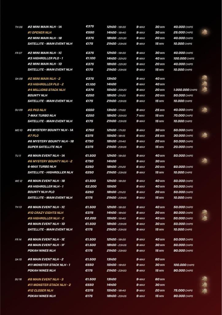 Les cash games tourneront chaque jour (blinds 2€/2€ et 5€/5€), la bière coulera à flot, et les joueurs français, belges et néerlandais se mélangeront autour des tables dans un pur esprit poker européen. Un vrai mix entre compétition, bonne humeur et adrénaline.