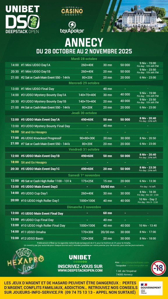 Du 28 octobre au 2 novembre 2025, le Casino Impérial d’Annecy accueillera une nouvelle fois l’une des étapes les plus attendues du circuit Unibet DeepStack Open. Une escale prestigieuse dans la « Venise des Alpes », qui promet une belle semaine de poker au bord du lac, en partenariat avec Texapoker et Unibet.