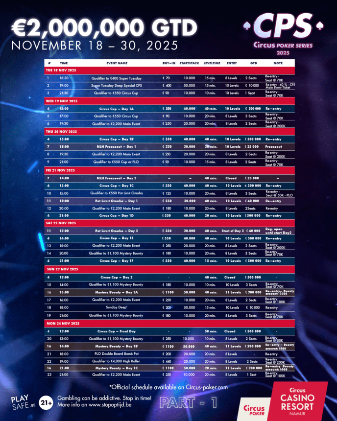Le Circus Casino Resort Namur s’apprête une nouvelle fois à devenir la capitale européenne du poker live. Du 18 au 30 novembre 2025, les Circus Poker Series (CPS) reviennent pour une troisième édition déjà très attendue, sous le parrainage de PokerStars. Treize jours de compétition, une série de tournois prestigieux, et un Main Event à 750.000€ garantis : la fin d’année s’annonce bouillante sur les bords de la Meuse.