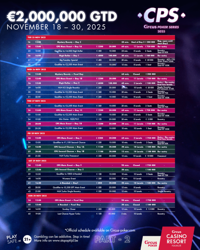 En seulement trois éditions, les Circus Poker Series se sont imposées comme l’un des festivals les plus attractifs d’Europe. Avec son alliance entre structures profondes, ambiance conviviale et garanties ambitieuses, le rendez-vous de Namur s’affirme comme un passage obligé pour tous les passionnés de poker live.