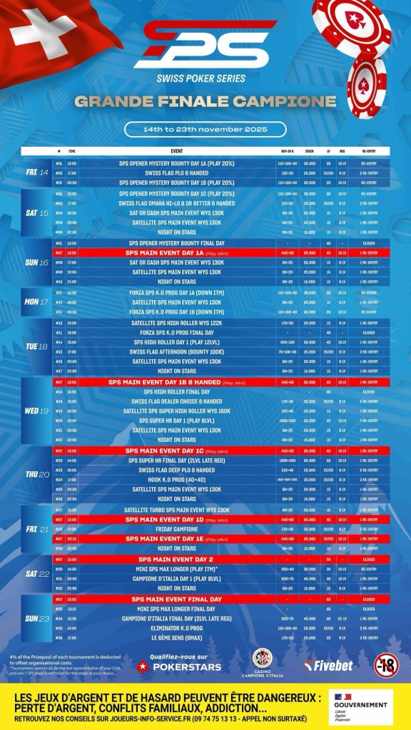 Du 14 au 23 novembre, Campione d’Italia accueillera la grande finale des Swiss Poker Series by Fivebet, avec un programme qui promet d’être aussi intense que dépaysant. Pourquoi faut-il absolument y être ? Voici 5 bonnes raisons de faire partie de l’aventure.