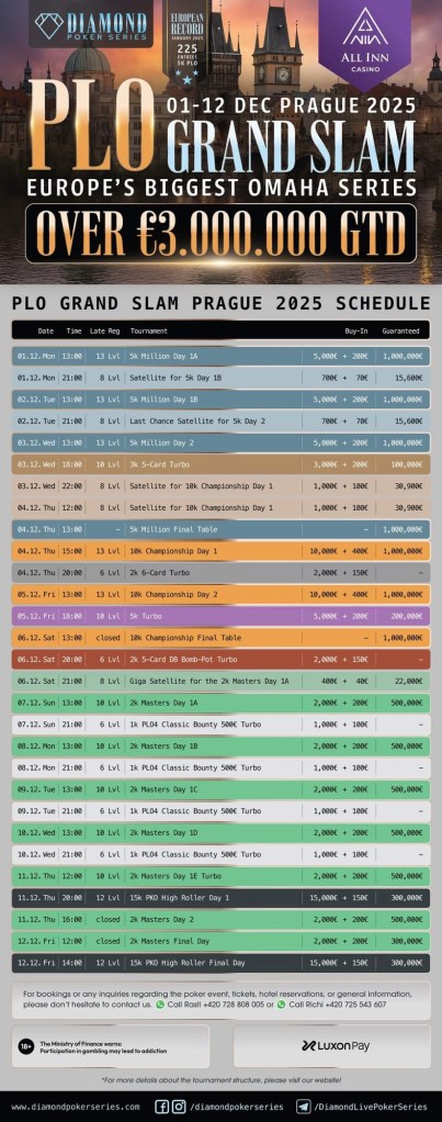 Après un début d’année historique marqué par un record européen à Tirana ( sur le 5K Million, 225 inscriptions, ce qui en fait le plus grand tournoi PLO à 5 000€ de l’histoire en Europe), les Diamond Poker Series poursuivent leur expansion avec une nouvelle étape d’envergure. Du 1er au 12 décembre 2025, le All Inn Casino de Prague accueillera le PLO Grand Slam, un festival entièrement consacré à l’Omaha, avec plus de 3 millions d’euros garantis et un programme calibré pour les plus exigeants.