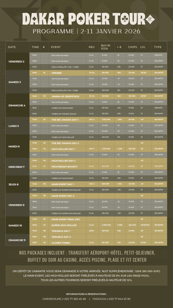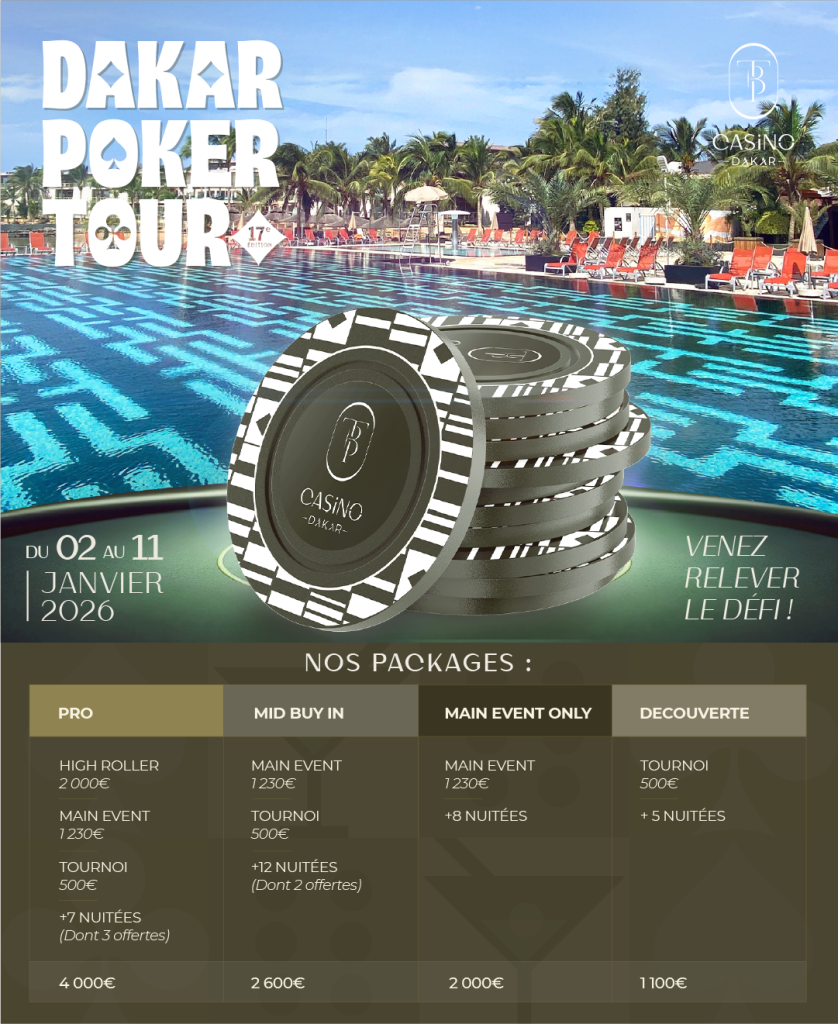 Ces offres font du Dakar Poker Tour non seulement un festival, mais aussi un véritable séjour poker, où tout est pensé pour simplifier la vie des joueurs.