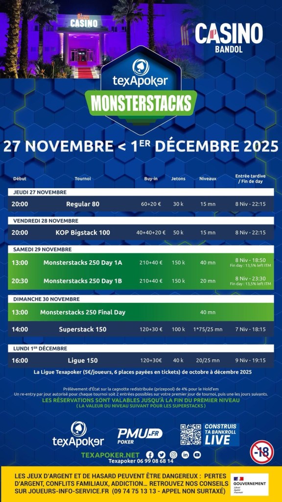 Texapoker revient poser ses valises au Casino de Bandol du 27 novembre au 1er décembre pour une nouvelle édition des Monsterstacks, avec un programme court, dense et calibré pour les amateurs de deep run.