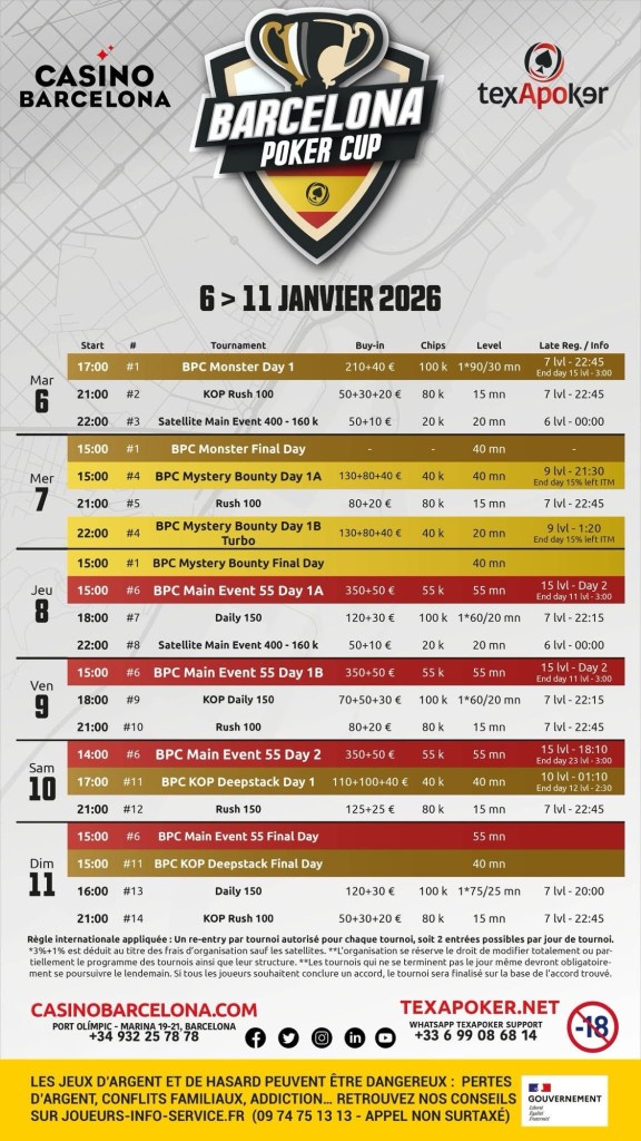 Texapoker ouvre son année 2026 en Espagne. Du 6 au 11 janvier, la Barcelona Poker Cup fait son retour au Casino Barcelona, avec un programme pensé pour les joueurs qui aiment les belles structures.