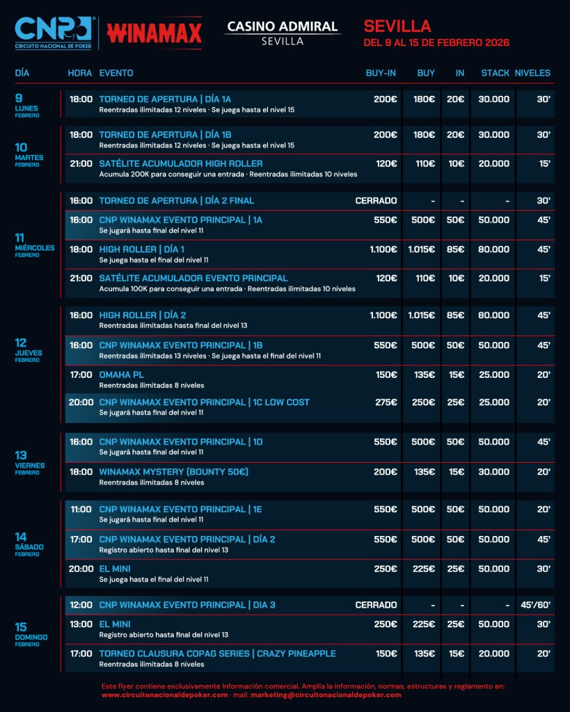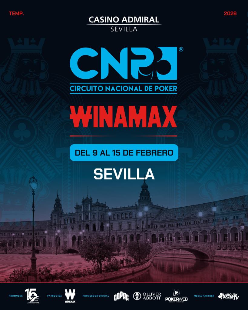 Le calendrier 2026 du Circuito Nacional de Poker Winamax est désormais posé. Et pour ouvrir l’année, le circuit fait le choix de la continuité… et de l’efficacité. Cap au sud de l’Espagne, direction Séville, où le Casino Admiral accueillera la première grande étape de la saison, du 9 au 15 février 2026. Une semaine ambitieuse, appelée à donner le ton des mois à venir.