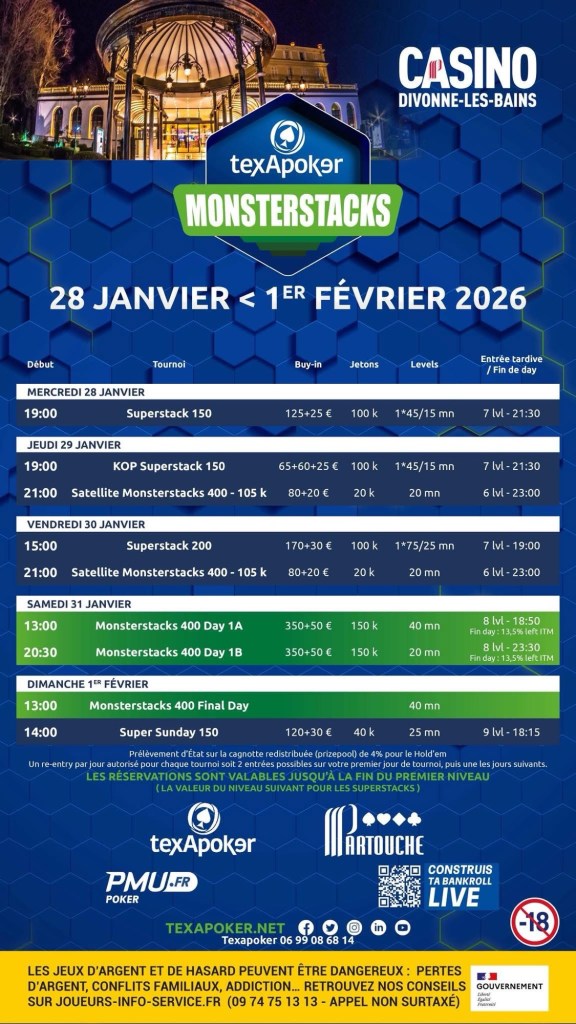 Avec ces Monsterstacks, Texapoker confirme sa ligne directrice : des buy-ins accessibles, des stacks confortables et une organisation rodée dans un cadre apprécié des joueurs. À Divonne, tous les ingrédients sont réunis pour un lancement de saison solide.