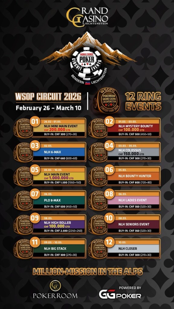 C’est une première historique pour le poker européen. Du 26 février au 10 mars 2026, le WSOP Circuit posera pour la première fois ses valises au Grand Casino Liechtenstein (GCLI), transformant le petit État alpin en véritable épicentre du poker live pendant près de deux semaines.