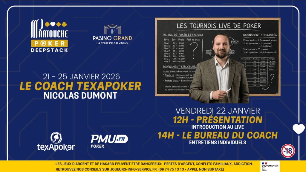 La collaboration débutera dès le Partouche Poker Deepstack (21–25 janvier) au Pasino Grand La Tour-de-Salvagny. Le vendredi 22 janvier, une conférence intitulée « Comment travailler son jeu pour le live » sera suivie d’entretiens personnalisés au Bureau du Coach.