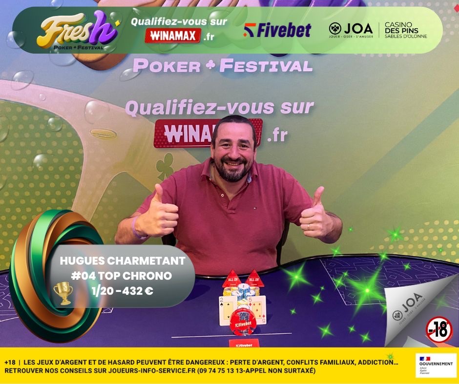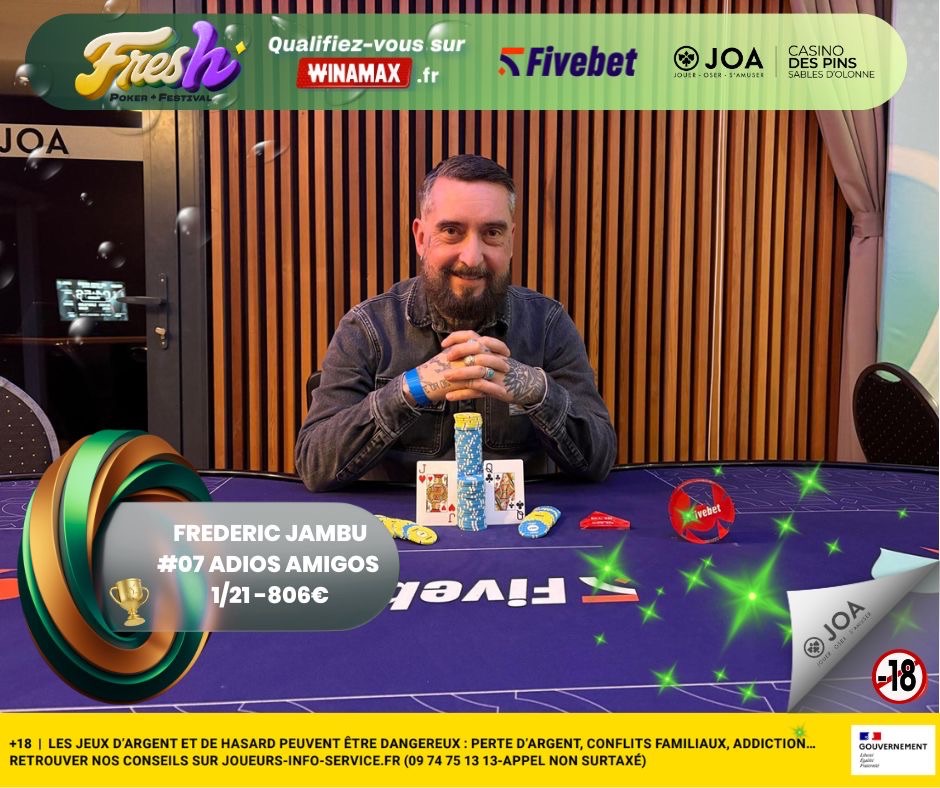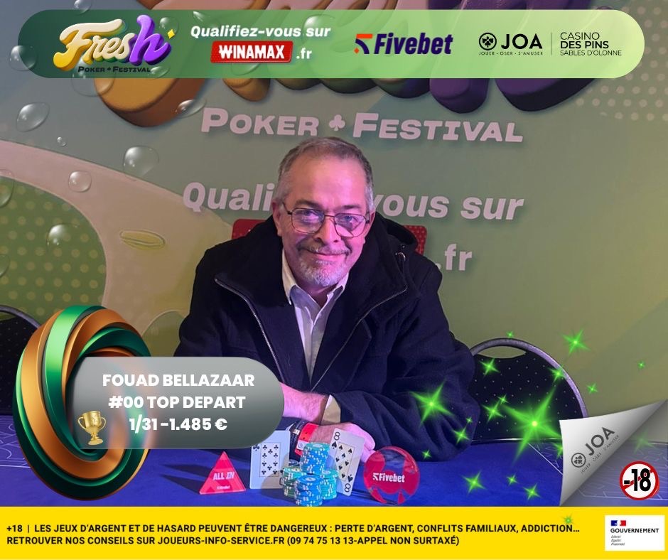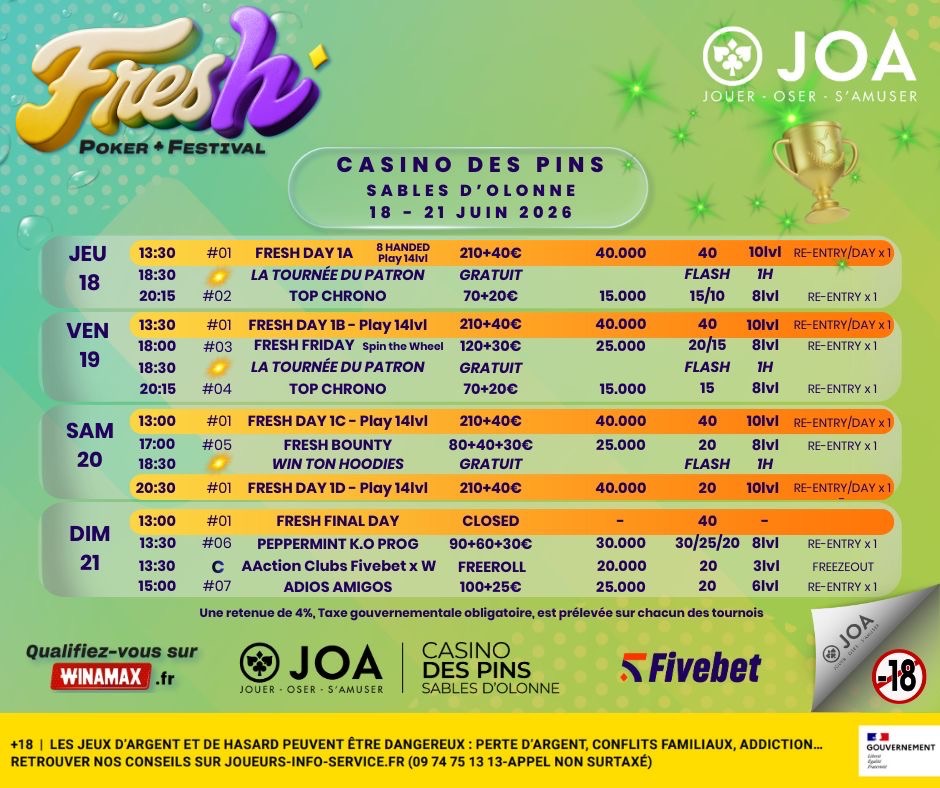 Le Fresh Poker Festival by JOA et Fivebet a fait escale au Casino des Pins Sables d’Olonne du 15 au 18 janvier 2026. Quatre jours de poker rythmés par une offre accessible et un Main Event qui a su concentrer l’attention des joueurs venus lancer leur saison dans un cadre convivial.