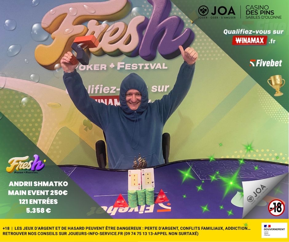 Le Fresh Main Event à 250 € a enregistré 121 entrées, générant un prizepool de 24 393,60 €. Après une table finale animée, Andrii Shmatko s’est montré le plus solide dans les moments clés pour s’imposer. Maîtrise des tempos, gestion de la pression et efficacité dans les coups importants lui permettent de conclure en tête et d’empocher 5 358 €.