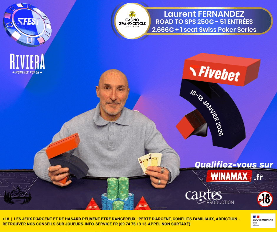 Le poker live était à l’honneur à Aix-les-Bains à l’occasion d’un festival organisé en partenariat avec Fivebet, dans le cadre du Riviera Monthly Poker, au Casino Grand Cercle. Une étape conviviale et bien rythmée, marquée par une belle affluence et des tables disputées jusqu’au bout.