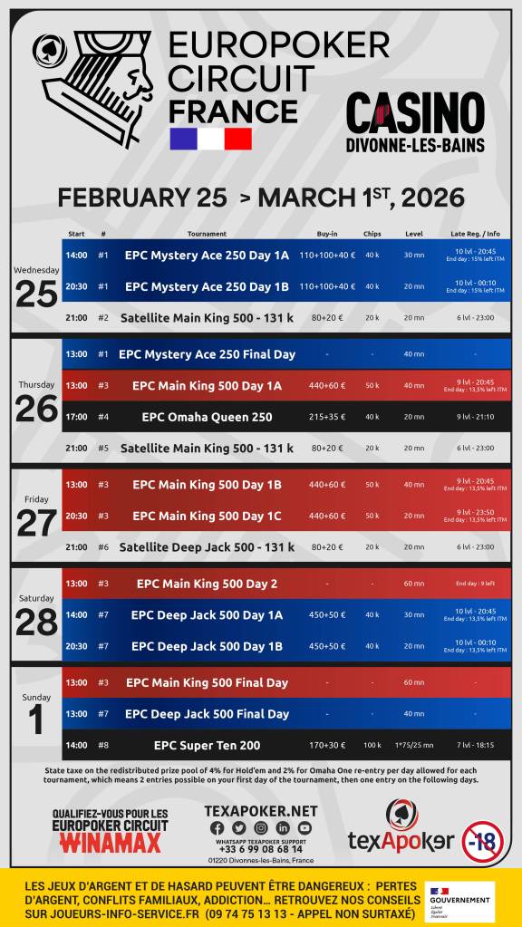 Un nouveau circuit fait son entrée sur la scène live européenne. Texapoker et Winamax unissent leurs forces pour lancer l’EuroPoker Circuit (EPC), un festival à buy-in modéré, pensé pour les joueurs réguliers comme pour les amateurs de tournois bien structurés. Dix étapes sont annoncées pour 2026, réparties entre la France, l’Espagne, l’Italie et le Portugal.